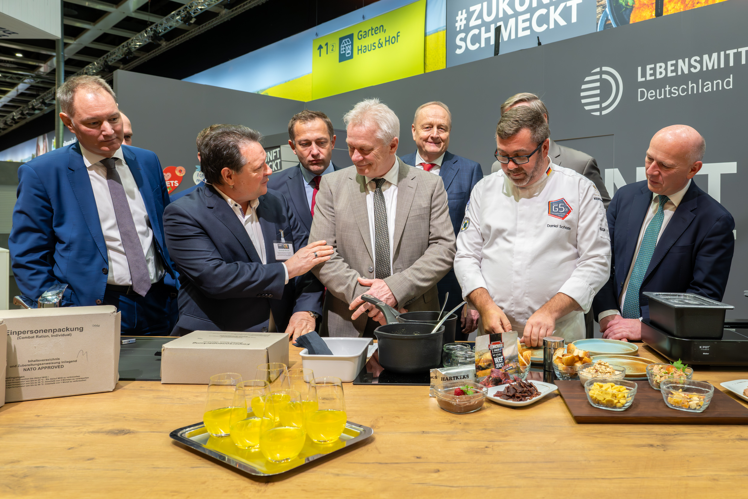 Schon am ersten Messetag wurde deutlich, dass Ernährung längst auch ein sicherheitspolitisches Thema ist. Am Stand diskutierten Alois Rainer, Berlins Regierender Bürgermeister Kai Wegner und Messechef Mario Tobias über Notfallversorgung. Aus Ein-Personen-Paketen mit rund 2.600 Kilokalorien bereiteten die Köche unter anderem Mousse au Chocolat, Currywurst und Erbseneintopf zu. Rainer würdigte den Ansatz ausdrücklich: „Großes Kompliment und herzlichen Dank, dass Sie das Thema Notfallversorgung auf der Grünen Woche aufgreifen. Als ich im Sommer darüber gesprochen habe, wurde ich ein Stück weit belächelt. Aber es ist ein Thema.“ In Zeiten multipler Krisen wird Resilienz zur strategischen Notwendigkeit. Der Minister kündigte an, die Ernährungsnotfallreserve aus den 1960er Jahren weiterzuentwickeln. BVE und Lebensmittelverband werden das Thema am 24. März beim Forum „Crisis Proof“ vertiefen.